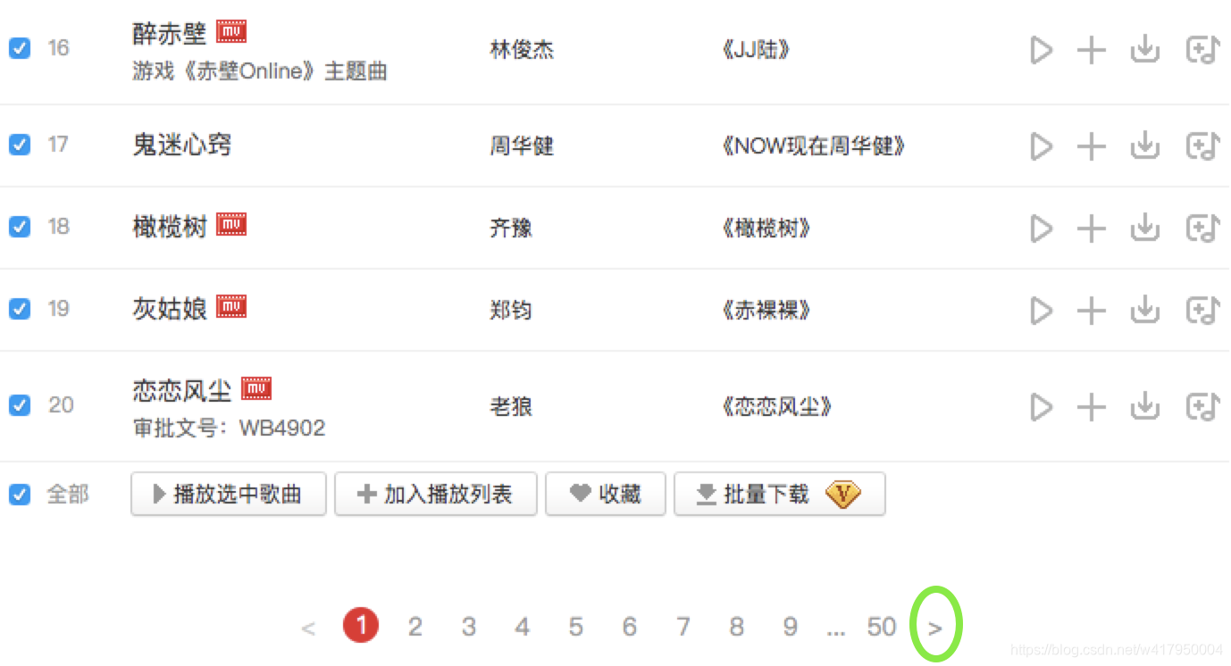 想法是通过绿色圆圈的“下一页”按钮,来获取下一页的页面,爬取页面上的歌曲信息。