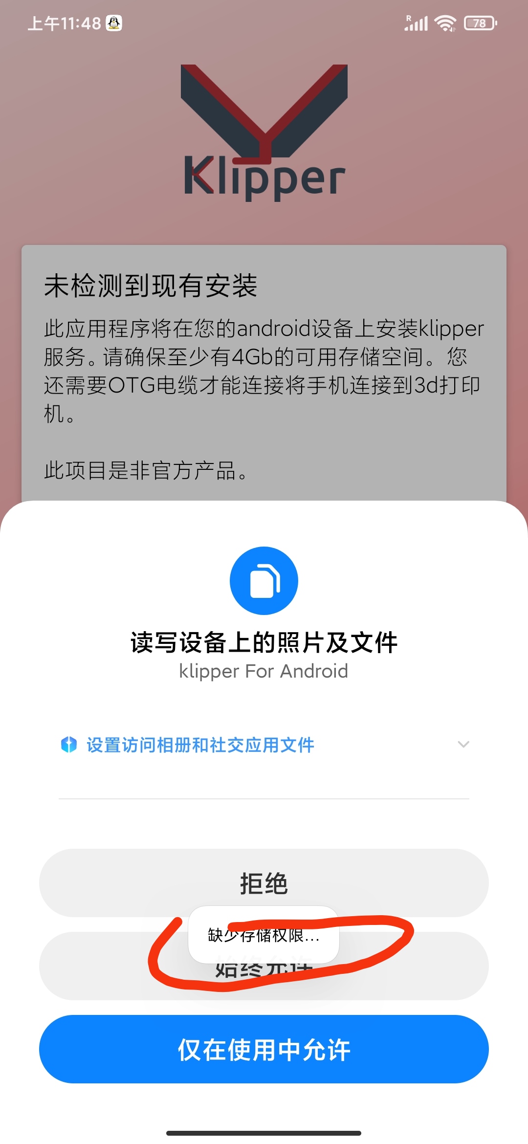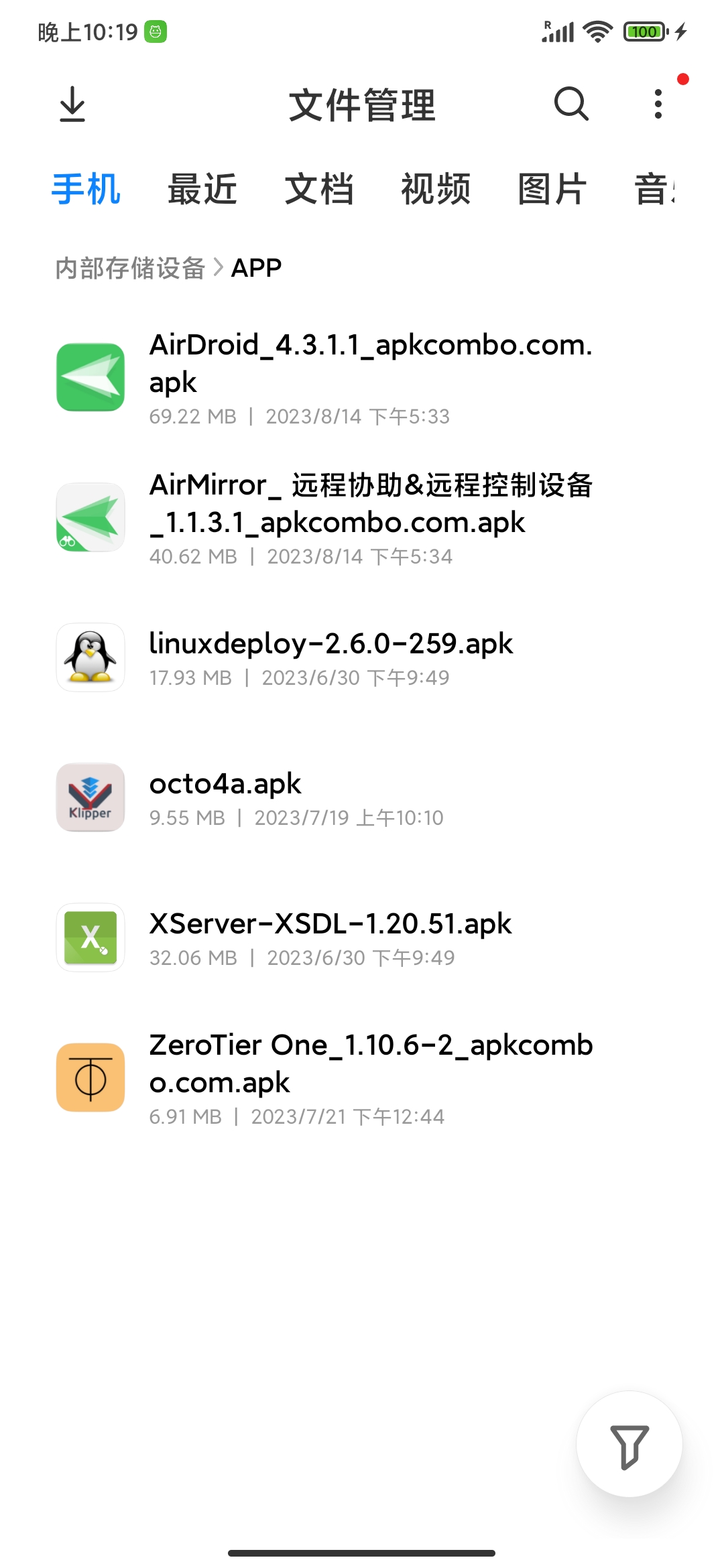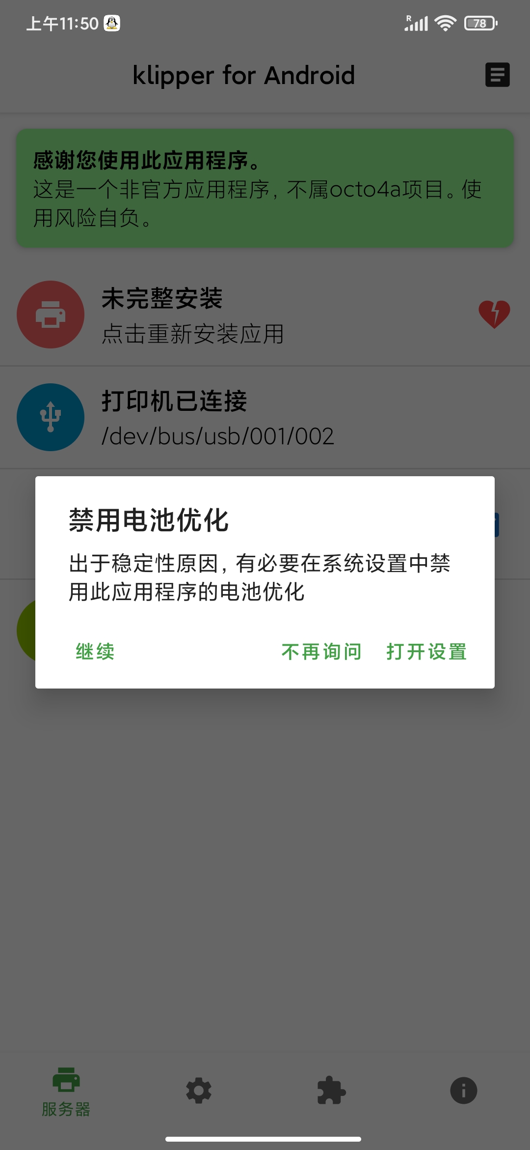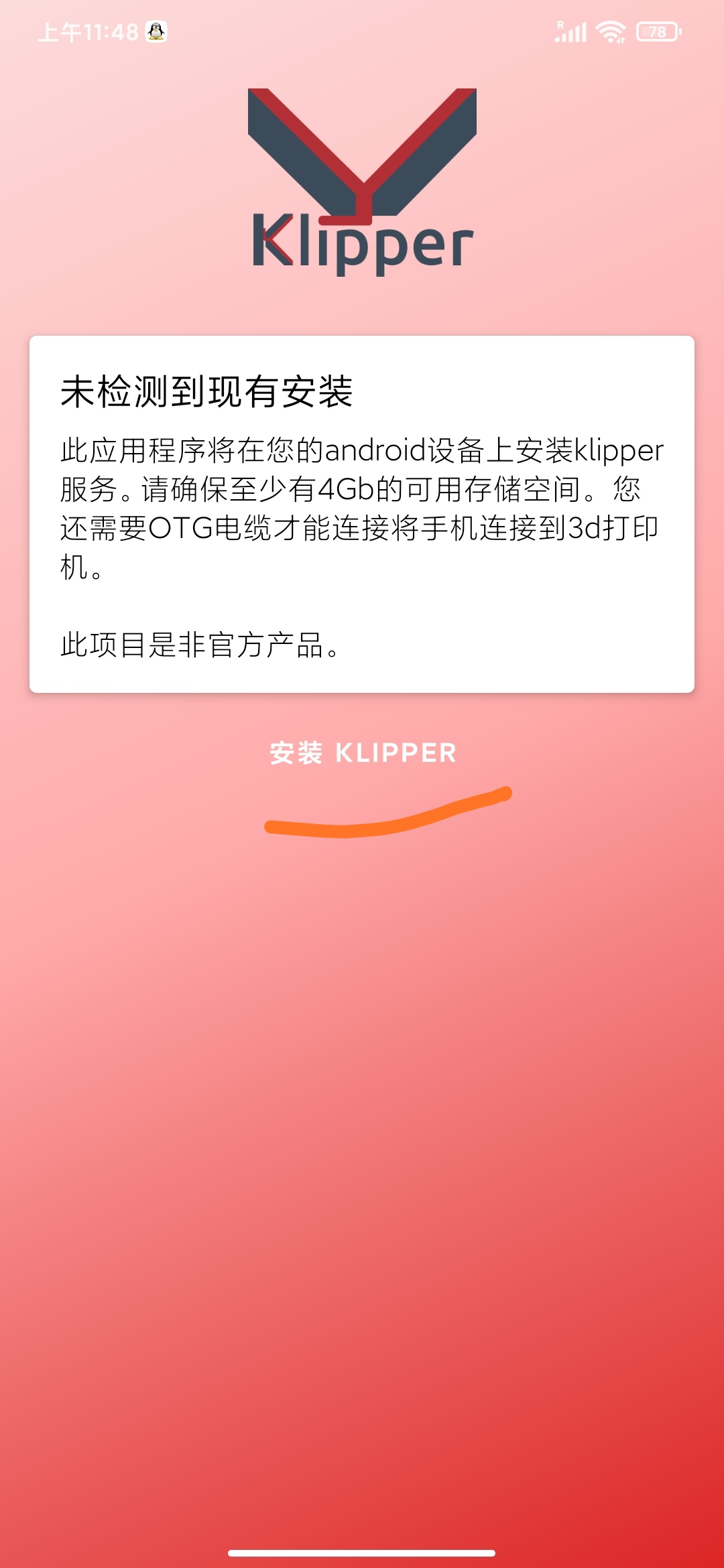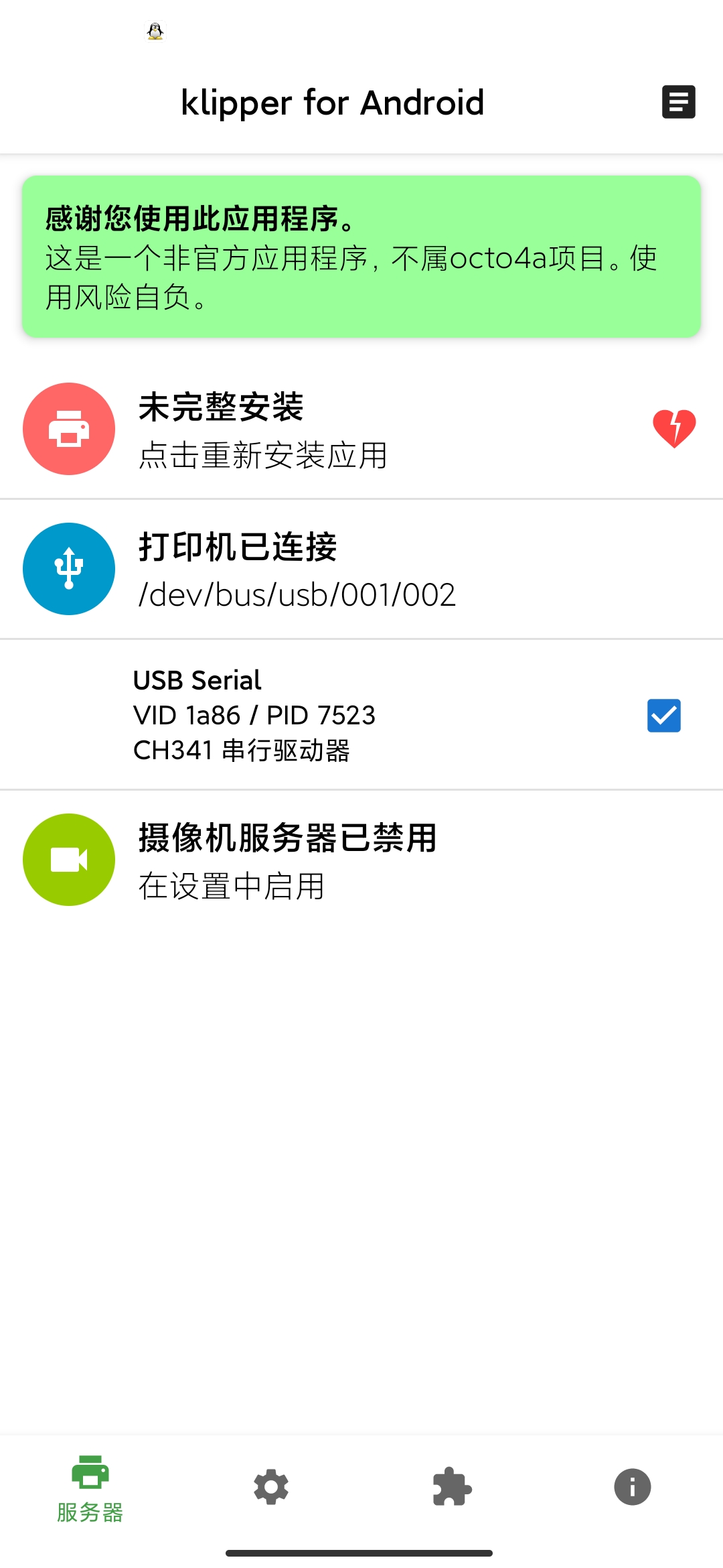 这里特别说明第四个软件,如果你安装完klipper能直接连接识别下位机就不需要安装这个软件,如果识别不了下位机就需要使用该软件,本来用的是原版octo4a,但是原版使用下载很慢,需要外网,所以选择使用了SYZ-Channel大佬的软件替代。原版教程可以查看https://www.bilibili.com/video/BV1YA411r7Bo/?spm_id_from=333.999.0.0&vd_source=1c36db546596f772d80e3007f42438e2