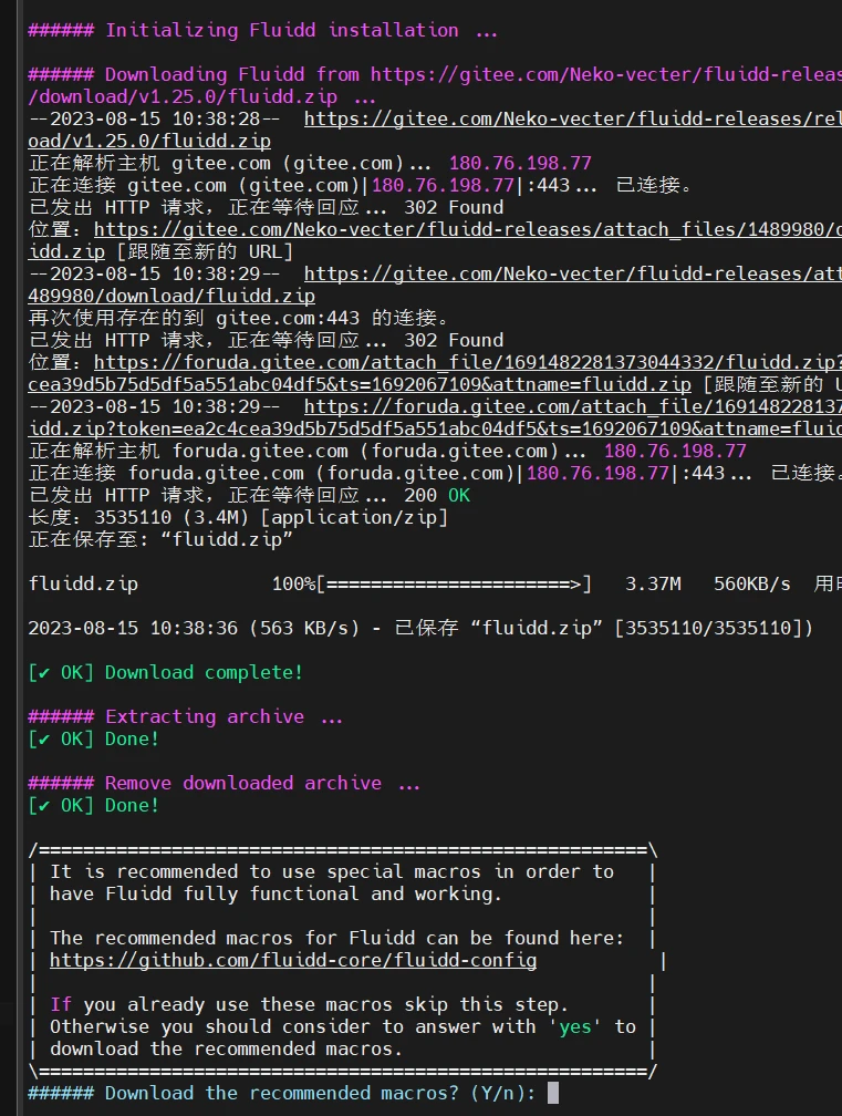 安装fluidd这里说明一下,这里意思是问你是否下载宏命令示例,这里直接选择n,因为选择y也无法下载成功。