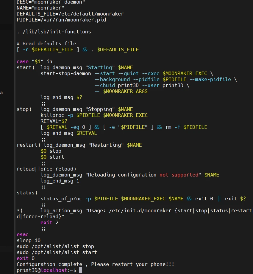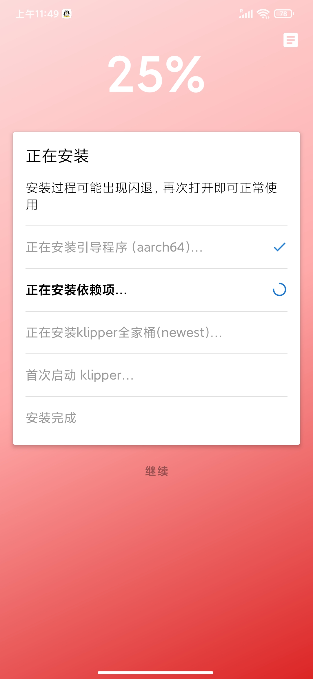 ###需要安装klipper,moonraker,fluidd(一键脚本暂时不支持Mainsail配置),KlipperScreen 这4个组件。 每安装完一个组件都会提示无法启动服务,这是安卓初始化系统与klipper全家桶服务启动方式不兼容的原因,不用管它,如果能启动起来就不用一键脚本去配置了。 组件安装涉及部分编译过程,耗时较长,耐心等待。只要是每个脚本都能自动安装到最后,基本就没有问题。