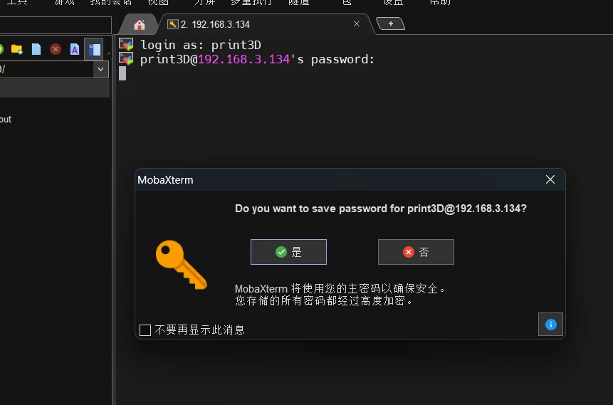 切换英文输入法,输入用户名print3D回车输入密码,密码是盲输入的,输入完直接按回车,前面没有指定用户的这里也可以选择是保存用户,点否下次还要输入用户名和密码