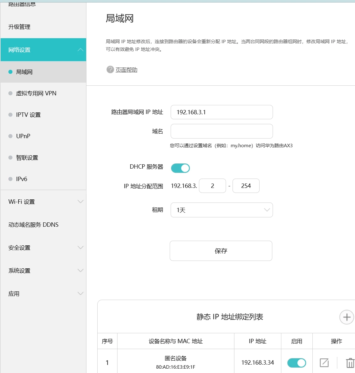 安装之前建议先到自己家里路由器管理界面设置该手机固定IP地址,由于路由器型号众多这里就不写教程了,可以百度自己路由器型号查询方法。下面图片是我华为路由器的设置。