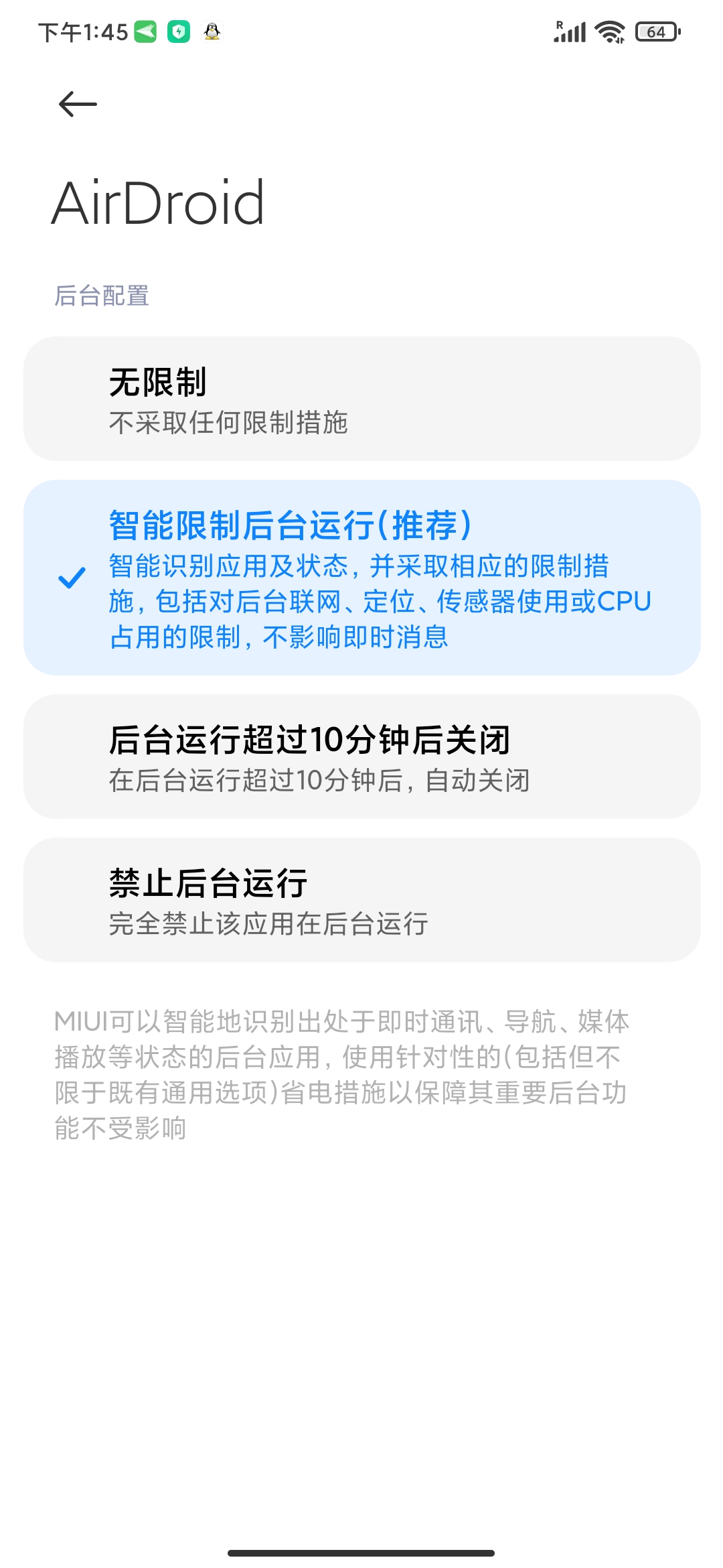 软件安装完打开的时候记得给权限,取消后台限制或者是省电排除之类的杀后台的限制。
