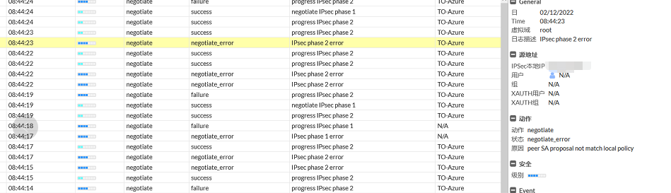 1. 我们在配置防火墙和Aruze云的IPSECVPN隧道后,隧道正常建立,两端的数据也可以正常访问,同时在两端也设置了link-monitor监控,但是很多时候在一两天后就会出现隧道中断的问题,通过Aruze云上从防火墙的日志上可以看到“peer SA proposal not match local policy”的错误,如下图: