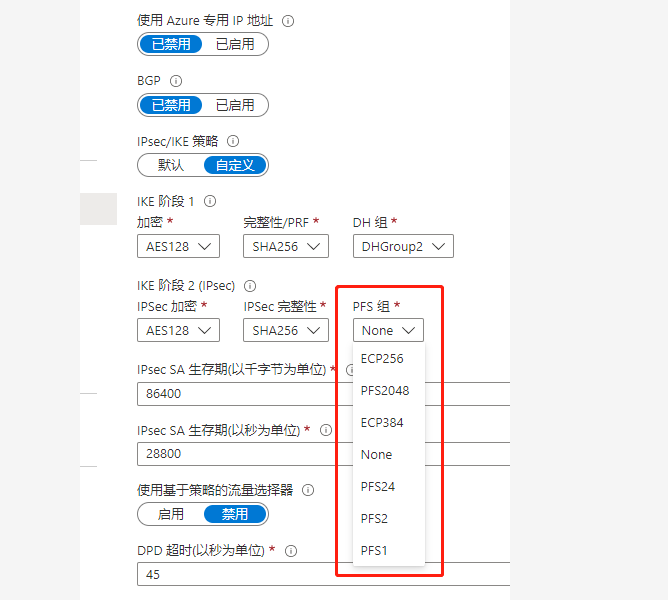 Aruze云上的IPSECVPN隧道阶段二一般没有DH组的选择,所以阶段二很多时候会选择None