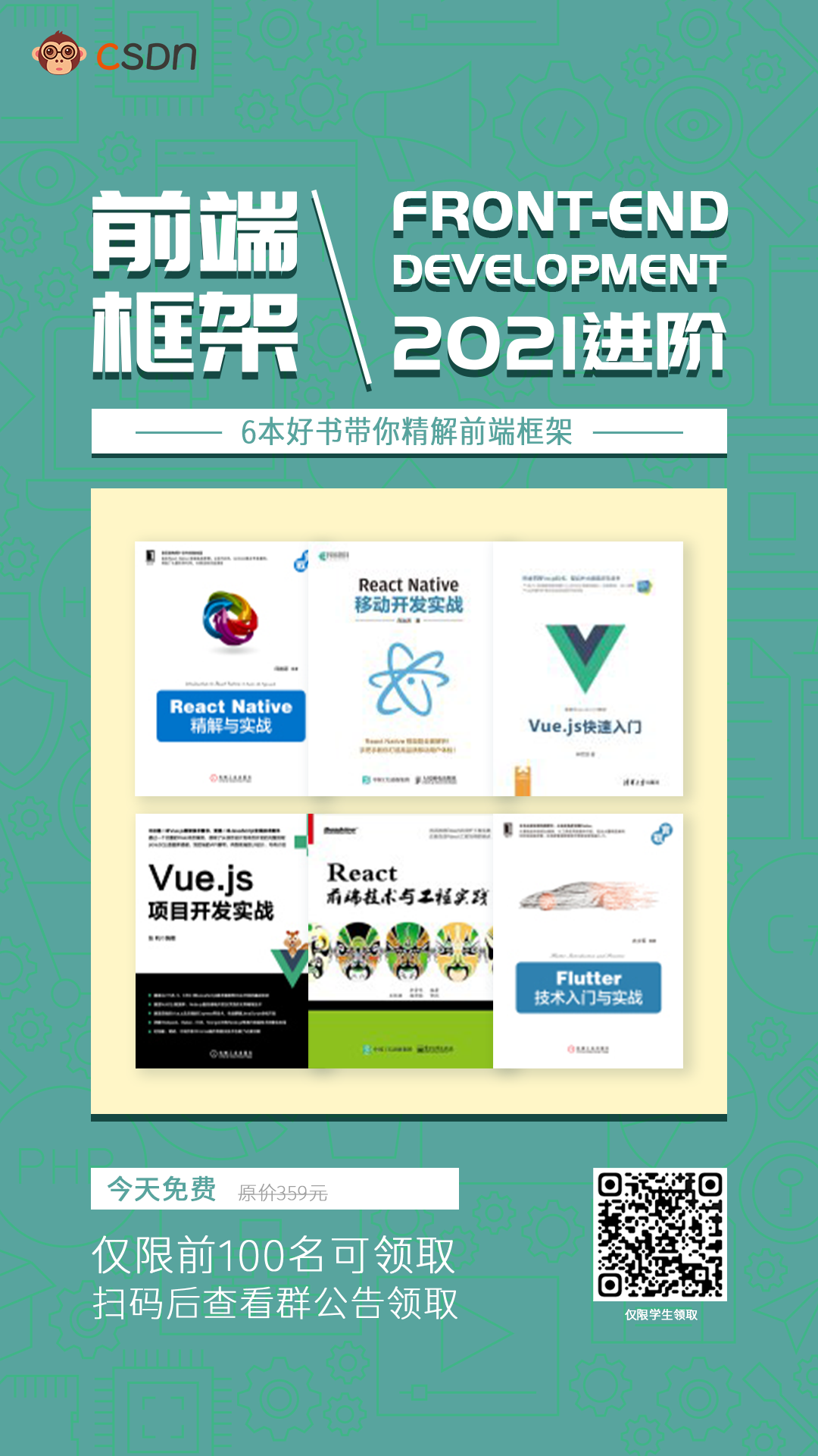 因此,今天给大家分享123篇【前端主流框架】精选学习资料,其中不仅详细讲解了VUE、React、flutter、weex、React Native等知识点,也同样包含了大量各大厂的面试原题。同时还有6本前端框架好书,扫码即可获取,限额100名!