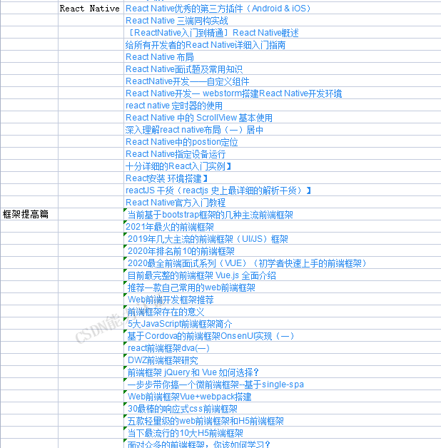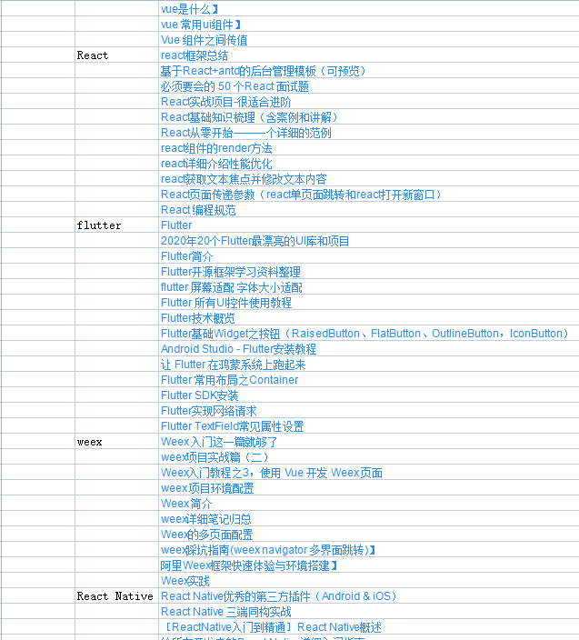 为了方便大家学习,我们发起了C站百万知识库行动,其中包含了123篇点击破万,收藏过千的【前端框架】学习资料总结,包含VUE、React、flutter、weex、React Native等知识点。无论你是刚刚接触Java、Python、前端的技术小白,还是已经有了一定基础的技术爱好者,在这里,你都可以找到你想要的资料。