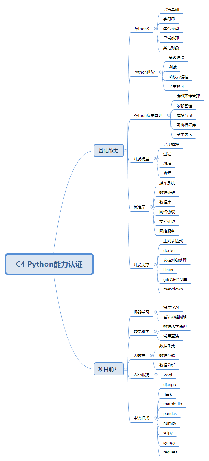下图是C站(CSDN)软件工程师能力认证标准中的C1/C4-能力认证图,分为基础能力和项目能力两大模块,可以看到模块中的技能点能够覆盖一线大厂开发工程师的招聘JD要求。