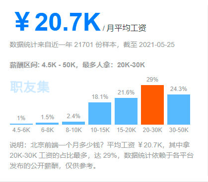 平均了金字塔顶部的前端专家和前端新人两群体后,20.7K 的薪资基本符合当前就业市场的整体形势。