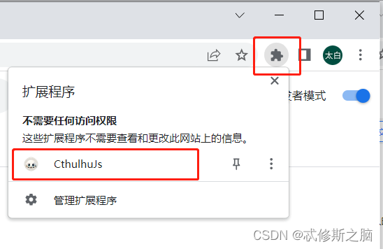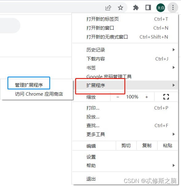 2.打开谷歌或edge浏览器,依次点击 扩展程序 、管理扩展程序: