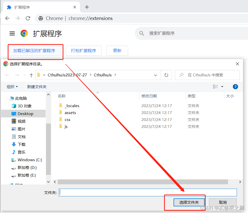 3.在扩展管理页面中点击 加载已解压的扩展程序,输入你解压的插件目录地址回车 ,再进入以下图中的目录,点击确认,然后在扩展程序管理中,找到刚安装的插件的详情按钮并点击,设置允许该插件在无痕模式中使用,至此,插件安装成功