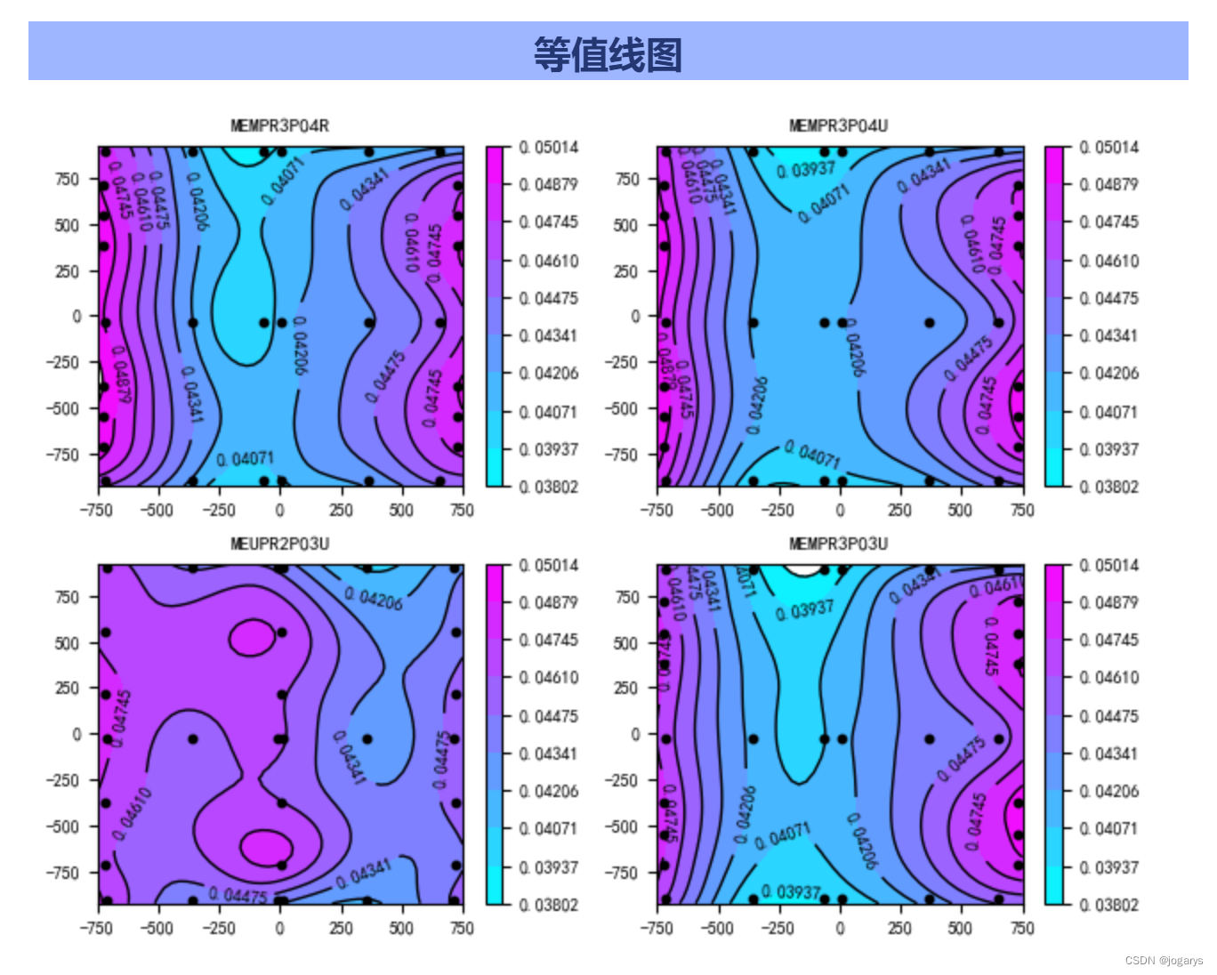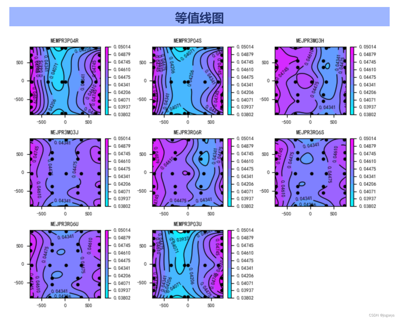 else:glasses = data['GLASS_ID'].unique()if leveltype == 0:level = levelnum+1else:value_max = data['VALUE'].max()value_min = data['VALUE'].min()level = np.linspace(value_min,value_max,levelnum+1)num = len(glasses)if col == 0:col = int(np.ceil(np.sqrt(num)))row = int(np.ceil(num/col))if zoomtype == 'large': plt.figure(figsize = (col*5,row*5))font_size = 10else:plt.figure()font_size = int(10/col**(1/3))plt.rc('font', size=font_size)for i in range(num):df = data[data['GLASS_ID']==glasses[i]]df1=df["COOR_GX"]#读取第一列数据df2=df['COOR_GY']#读取第二列数据df3=df['VALUE']#读取第三列数据odf1=np.linspace(-750,750,50)#设置网格经度odf2=np.linspace(-925,925,50)#设置网格纬度odf1,odf2=np.meshgrid(odf1,odf2)#网格化func=Rbf(df1,df2,df3,function='cubic')#定义插值函数odf3_new=func(odf1,odf2)#获得插值后的z值ax1 = plt.subplot(row,col,i+1)plt.title(glasses[i], fontsize=int(font_size*1.2))if contourLine == 'yes':line = plt.contour(odf1,odf2,odf3_new,level,colors = 'black',linewidths=1.0)plt.clabel(line , inline=True)plt.contourf(odf1,odf2,odf3_new,level,cmap=colortype)#画图plt.colorbar()plt.scatter(df1,df2,c='black',s=10)plt.tight_layout()plt.savefig('contourplot.png')
