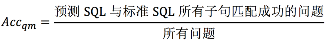 Text-to-SQL任务的评价方法主要包含两种:精确匹配率(Exact Match, Accqm)、执行正确率(Execution Accuracy, Accex)。
