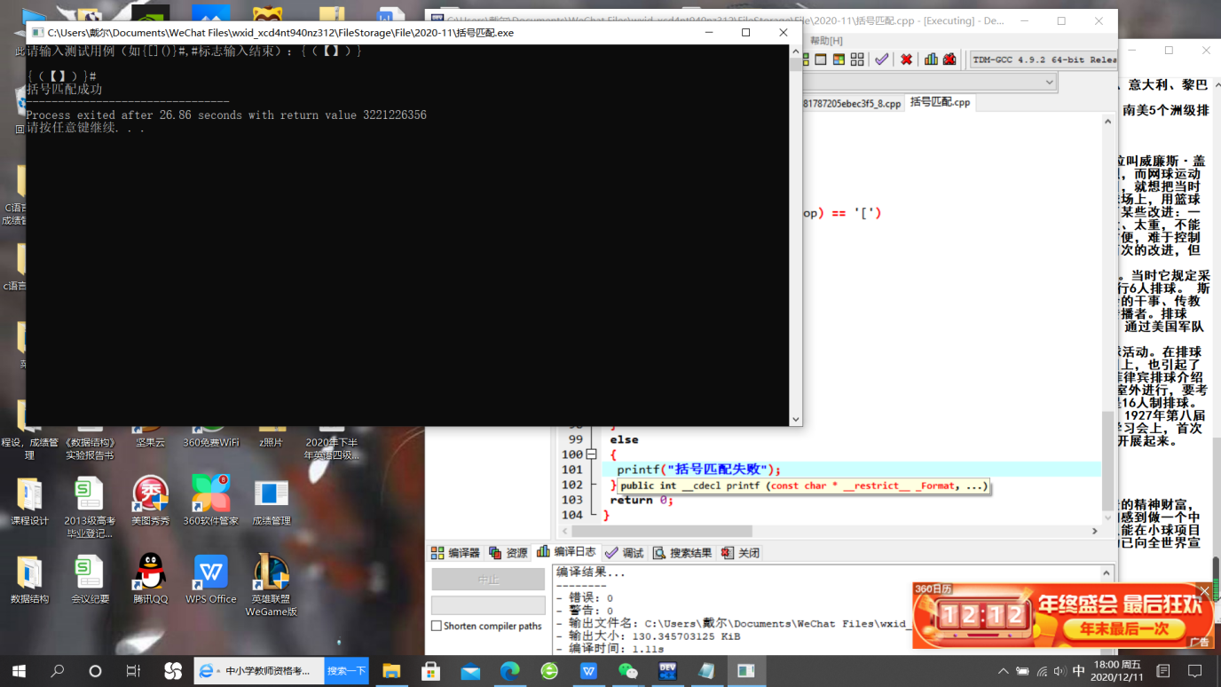 括号问题可以用来解决C语言中的“{”和“}”的匹配问题,可以观察到,如果从左至右扫描一个字符串,那么每个右括号将于最近遇到的那个未匹配的左括号相匹配,在从左至右的扫描工程中把所遇到的左括号存放到堆栈内,每当遇到一个右括号时,就将它与栈顶的左括号(如果存在)相匹配,同时从栈顶删除该左括号。