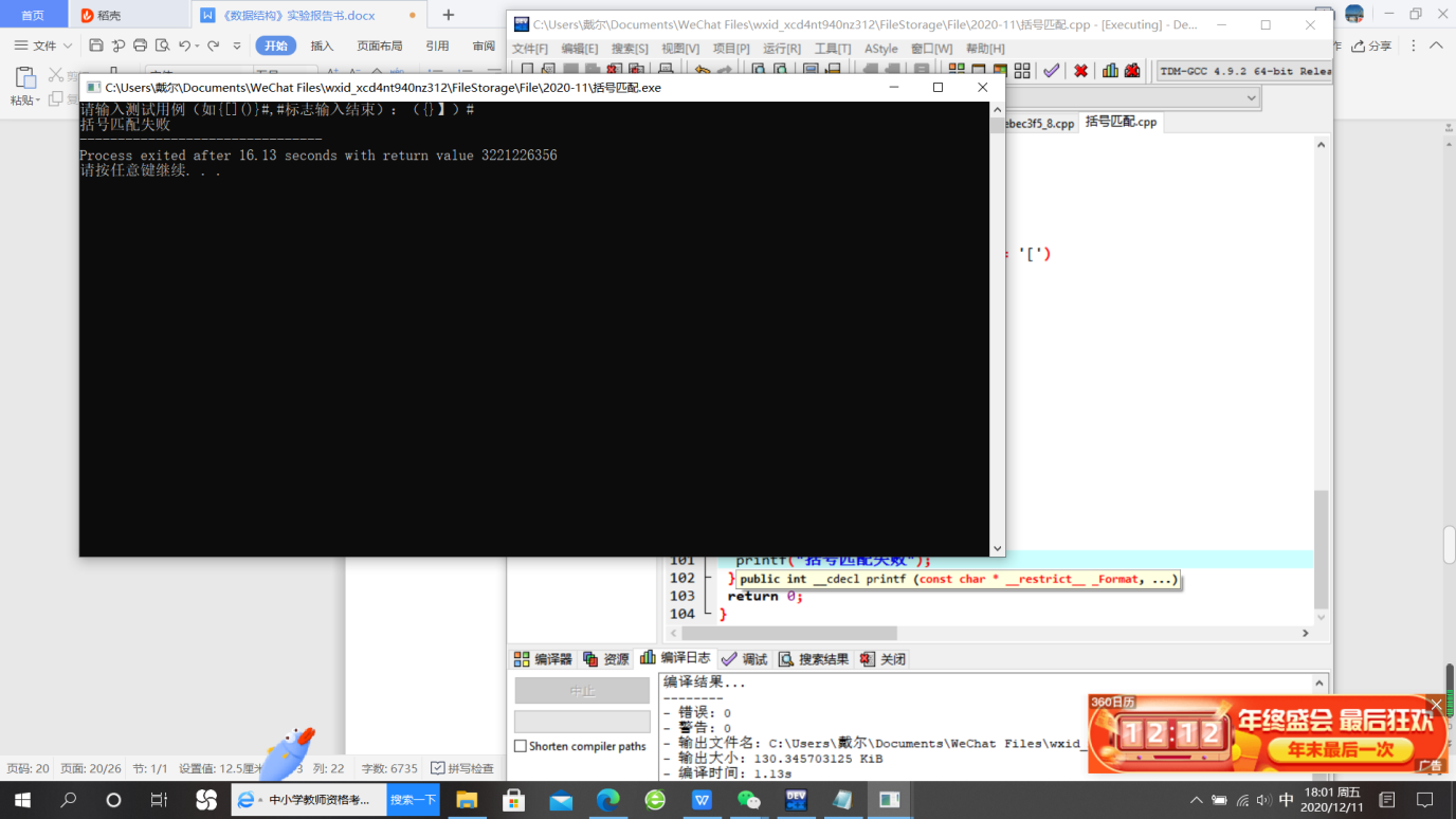 #include#includetypedef struct{char * base;char * top;int stacksize;}stack;void initstack(stack*s)//栈的初始化函数{s->base = (char*)malloc(sizeof(char));if (!s->base)//检测内存是否分配成功{exit(0);}s->base = s->top;s->stacksize = 10;}void push(stack*s, char x)//入栈函数{if (s->top - s->base >= s->stacksize)//先检测是否发生上溢{s->base = (char*)realloc(s->base, (s->stacksize + 10) * sizeof(char));//若发生,则增加10个内存空间(动态扩容)if (!s->base)//检测内存是否分配成功{exit(0);}s->stacksize = s->stacksize + 10;s->top = s->base + 10;}*s->top = x;s->top++;}int main(){stack * s = (stack*)malloc(sizeof(stack));initstack(s);char c;printf("请输入测试用例(如{[]()}#,#标志输入结束):");c=getchar();push(s,c);while (c != '#'){c=getchar();if (c == '{'||c == '('||c == '['){push(s, c);}if (c == '}'||c == ')'||c == ']'){if (s->base == s->top){push(s, c);}if (c == '}'){if (*--(s->top) == '{')//这里解释下,*--(s->top)很明显是栈顶元素,但是这个操作已经实现了top--。变相的实现了pop功能。所以实际上是没有删除栈中的元素,只是移动top指针,不断的覆盖元素。{//top--已经实现,这里不需要任何操作}else{push(s, c);}}if (c == ')'){if (*--(s->top) == '('){}else{push(s, c);}}if (c == ']'){if (*--(s->top) == '['){}else{push(s, c);}}}}if (s->base == s->top){printf("括号匹配成功");}else{printf("括号匹配失败");}return 0;}