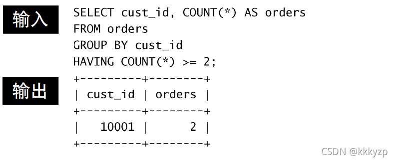 这条SELECT语句的前3行类似于上面的语句。最后一行增加了 HAVING子句,它过滤COUNT(*) >=2(两个以上的订单)的那些 分组。