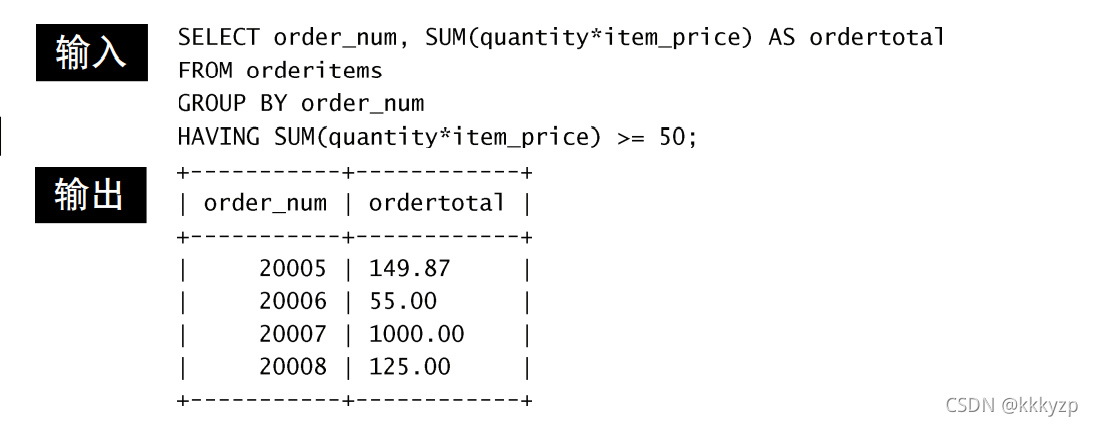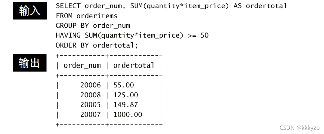 在这个例子中,GROUP BY子句用来按订单号(order_num列) 分组数据,以便SUM(*)函数能够返回总计订单价格。HAVING子 句过滤数据,使得只返回总计订单价格大于等于50的订单。最后,用ORDER BY子句排序输出。