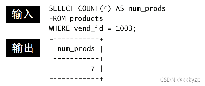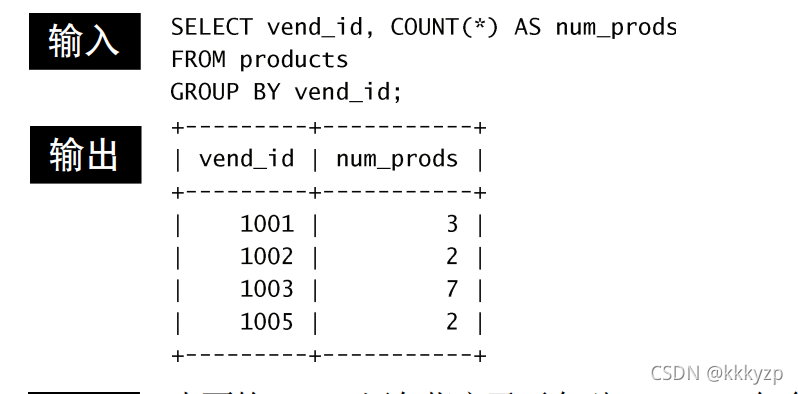 上面的SELECT语句指定了两个列,vend_id包含产品供应商的ID, num_prods为计算字段(用COUNT(*)函数建立)。GROUP BY子句指 示MySQL按vend_id排序并分组数据。这导致对每个vend_id而不是整个表 计算num_prods一次。从输出中可以看到,供应商1001有3个产品,供应商 1002有2个产品,供应商1003有7个产品,而供应商1005有2个产品。