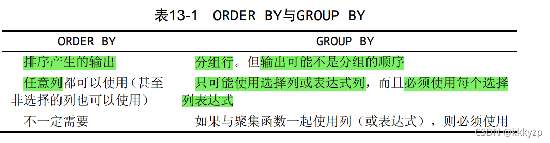 表13-1中列出的第一项差别极为重要。我们经常发现用GROUP BY分 组的数据确实是以分组顺序输出的。但情况并不总是这样,它并不是SQL 规范所要求的。此外,用户也可能会要求以不同于分组的顺序排序。仅 因为你以某种方式分组数据(获得特定的分组聚集值),并不表示你需要 以相同的方式排序输出。应该提供明确的ORDER BY子句,即使其效果等 同于GROUP BY子句也是如此。