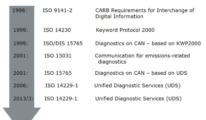 对于任何一个技术协议都不是一蹴而就,就比如我们现在常用诊断协议ISO 14229,也不是起初就有的,如下是诊断协议的一个发展示意图: