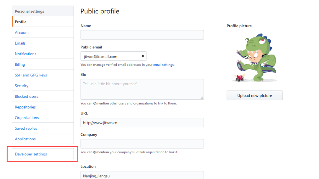 进入 Github 的 Setting 页面,点击 Developer settings,如图所示: