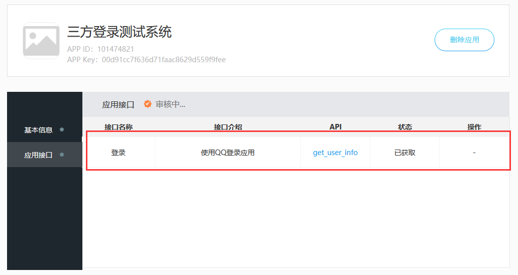 注册后,可以看到应用的 APP ID、APP Key,以及你被允许的接口,当然只有一个获取用户信息。