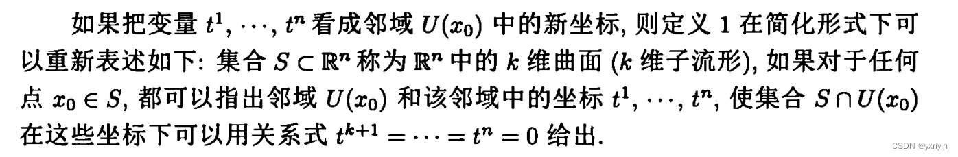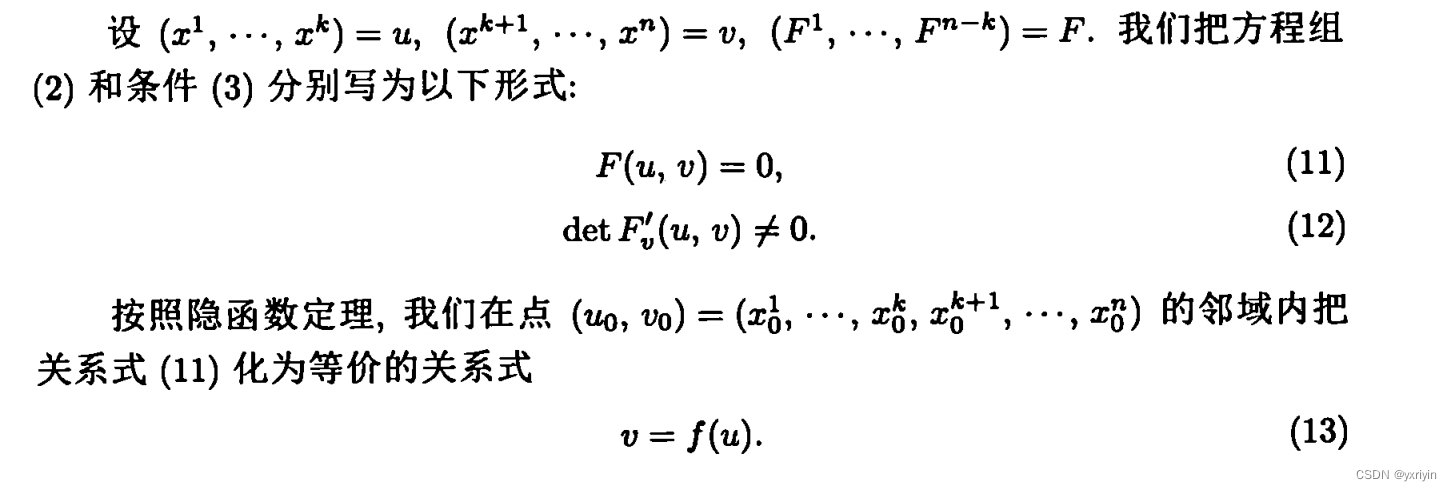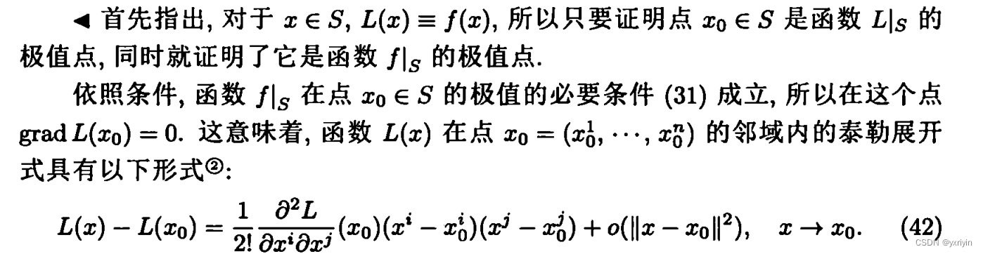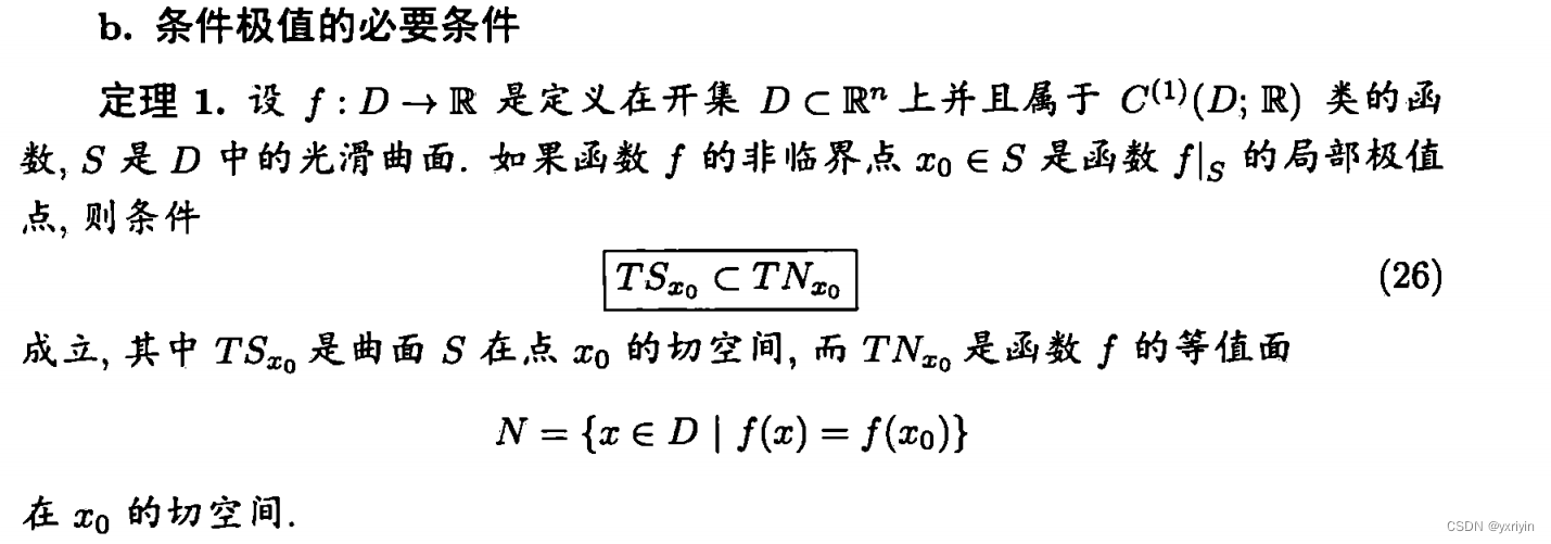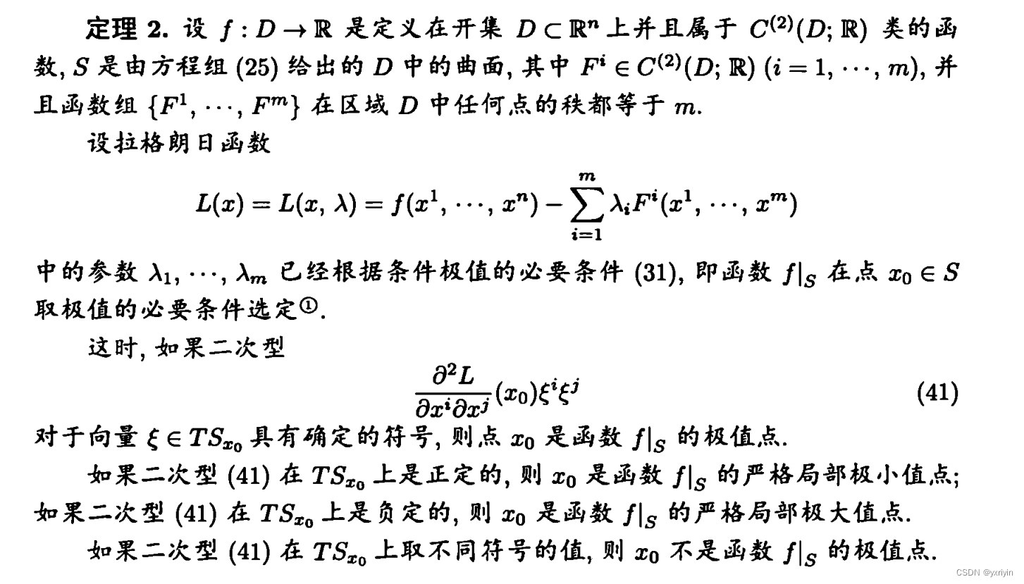 这里要注意,为什么可以认为x只有n-m维度,是因为我们限制了条件极值在D中,而S则是方程组F给定的曲面,而F的秩是m。