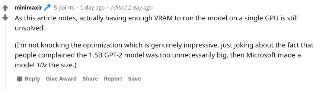 我不是针对他们令人印象深刻的优化方法,只是在模型体量上开个玩笑,因为人们在抱怨 15 亿参数的 GPT-2 太庞大之后,微软就造出了大 10 倍的模型。