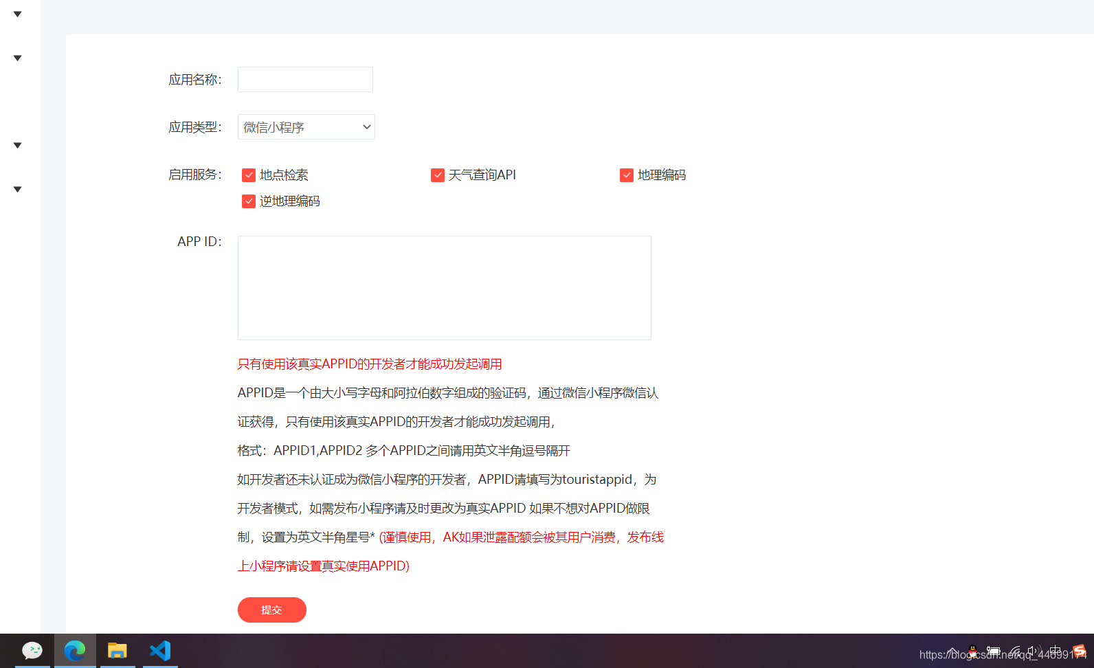appid写自己小程序的APPID,但是我在写这里的时候遇到了一点小麻烦,输入自己的appid之后,一直显示格式错误,不得以之下选择了填上他给的默认值touristappid,然后提交之后如下图