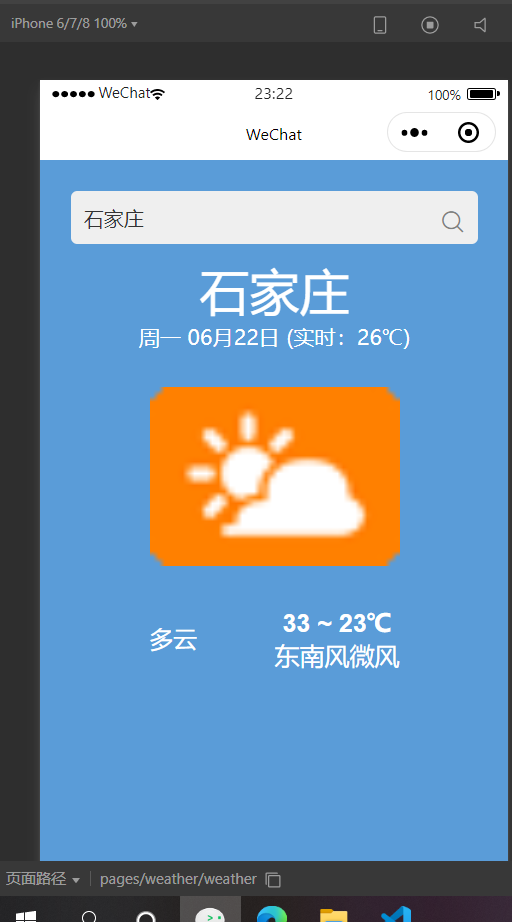 Page({/*** 页面的初始数据*/data: {},//动态获取input输入值,城市名称bindKeyInput:function(e){defaultcity = e.detail.value},//搜索城市search: function(e) {this.weather()},weather: function() {wx.showLoading({title: '加载中',})wx.request({url: 'https://api.map.baidu.com/telematics/v3/weather?output=json&ak=自己的ak&location=' + defaultcity,success: res => {console.log(res.data)if (!res.data.results) {console.log('获取天气接口失败')return}getweather = res.data.results[0].weather_data[0].weathergettemp = res.data.results[0].weather_data[0].temperaturegetwind = res.data.results[0].weather_data[0].windgetpic = res.data.results[0].weather_data[0].dayPictureUrlgetdate = res.data.results[0].weather_data[0].datethis.setData({city: defaultcity,weather: getweather,temp: gettemp,wind: getwind,pic: getpic,date: getdate})wx.hideLoading()}})},})