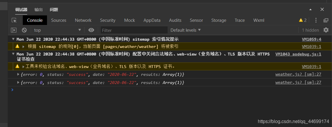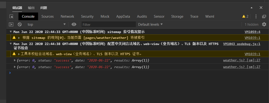 search: function(e) {var that = this wx.request({url: 'https://api.map.baidu.com/telematics/v3/weather?output=json&ak=这里写自己申请的百度ak&location=' + defaultcity,success: res => {console.log(res.data)if (!res.data.results) {console.log('获取天气接口失败')return}getweather = res.data.results[0].weather_data[0].weathergettemp = res.data.results[0].weather_data[0].temperaturegetwind = res.data.results[0].weather_data[0].windgetpic = res.data.results[0].weather_data[0].dayPictureUrlgetdate = res.data.results[0].weather_data[0].datethis.setData({city: defaultcity,weather: getweather,temp: gettemp,wind: getwind,pic: getpic,date: getdate})wx.hideLoading()}})},