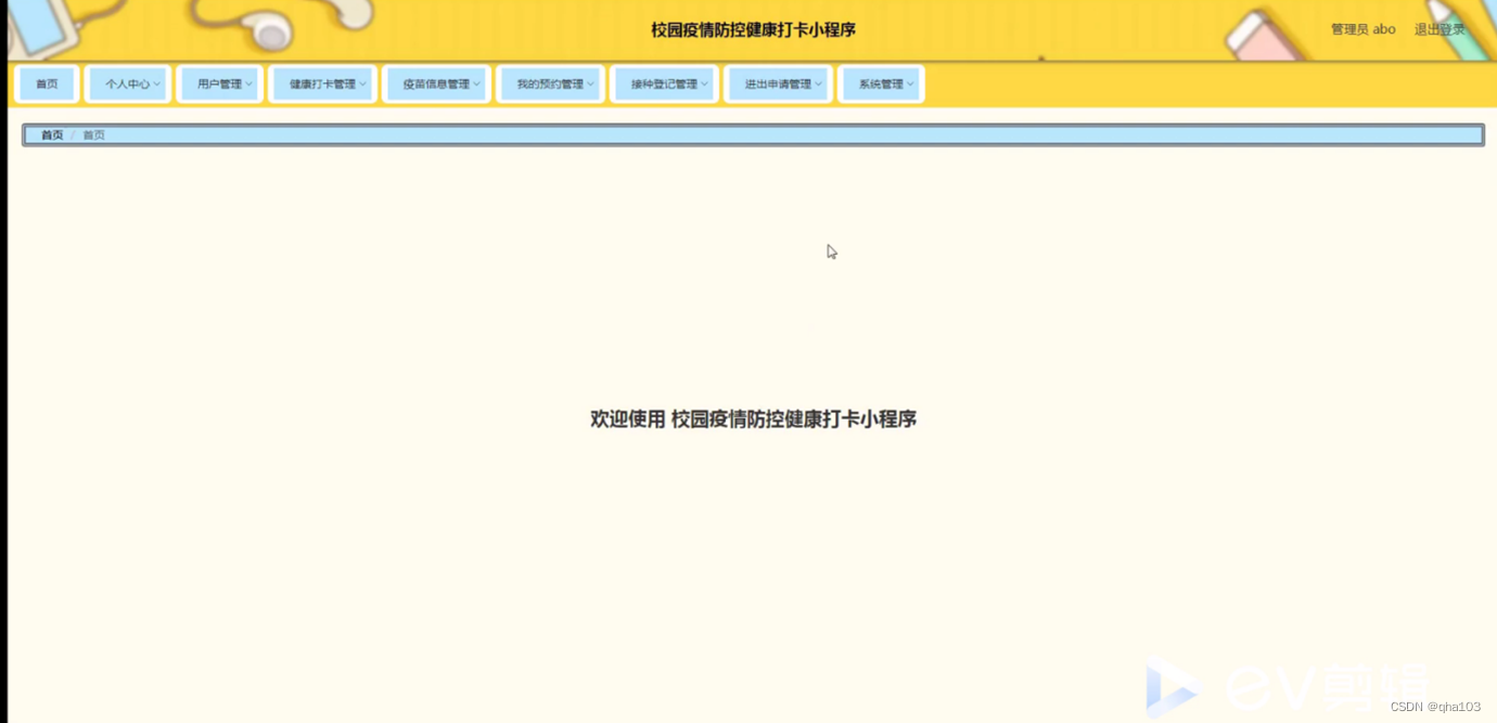 管理员登录进入系统后台,可查看并使用个人中心、用户管理、健康打卡管理、疫苗信息管理、我的预约管理、接种登记管理、进出申请管理、系统管理等功能模块,如图5-12所示。