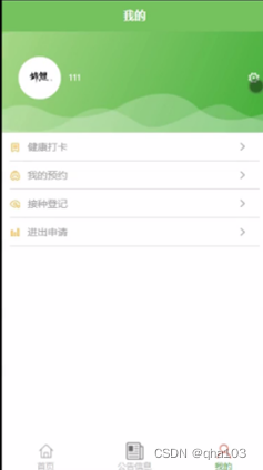 在我的界面,用户可使用健康打卡、我的预约、接种登记、进出申请等功能模块,如图5-4所示。