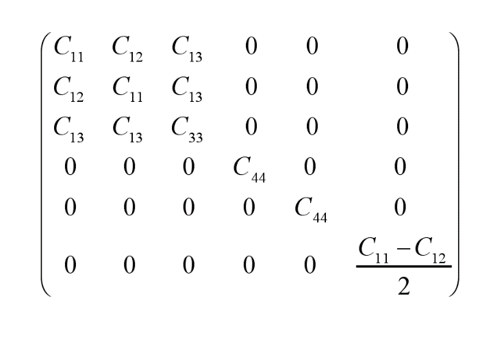 以六角晶系为例进行说明,其独立的弹性常数有C11,C12,C13,C33和C44: