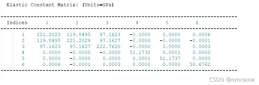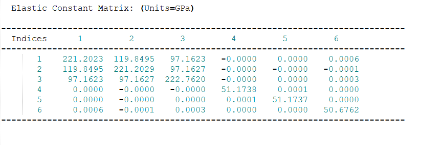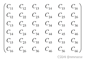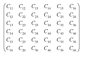 弹性常数描述了晶体对外加应变的响应的刚度。在材料的微小线性变形范围内,体系的应力与应变满足胡克定律。对于足够小的变形,应力与应变成正比,三维材料的弹性刚度常数矩阵是6×6: