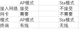 Sta模式: Station, 类似于无线终端,sta本身并不接受无线的接入,它可以连接到AP,一般无线网卡即工作在该模式。