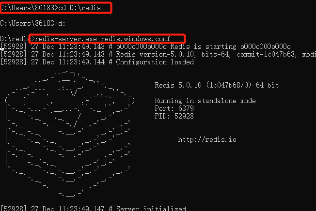 第三步 cmd进入到 此目录 运行命令redis-server.exe redis.windows.conf 启动完毕