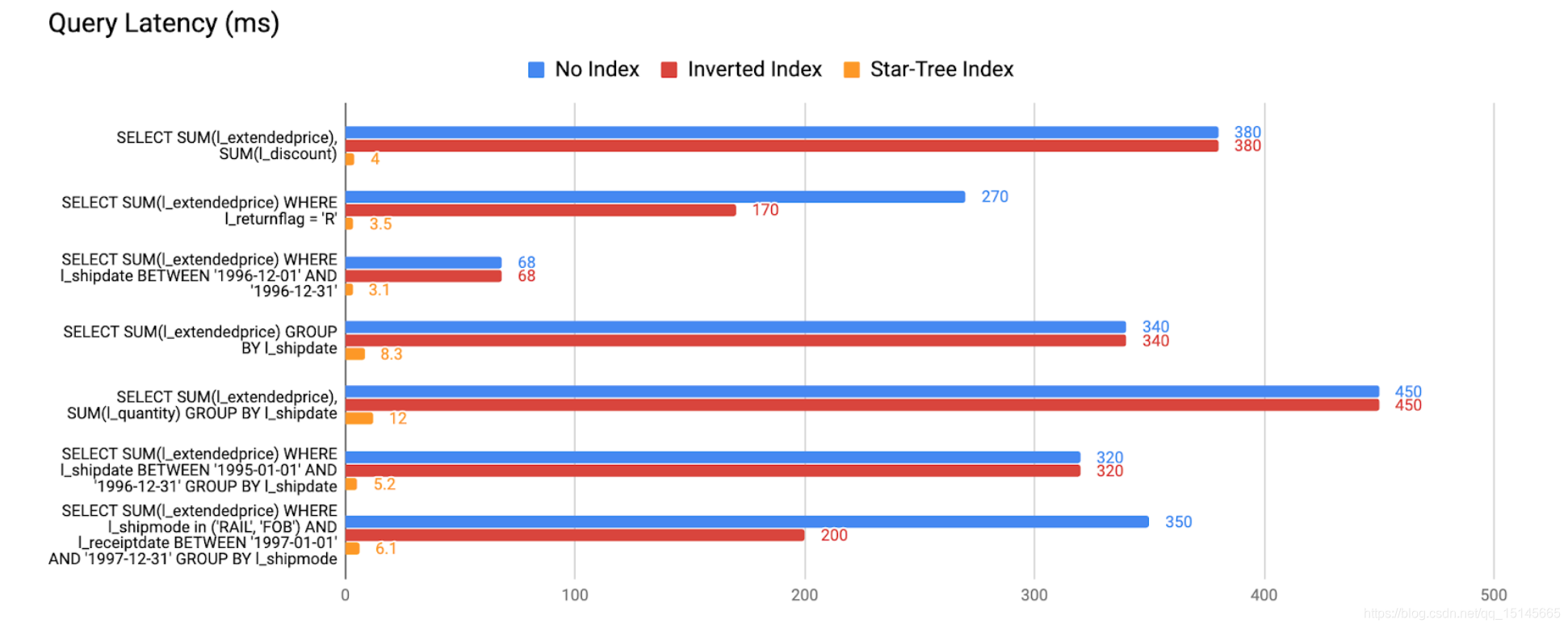 我们已经进行了基准测试,比较了从Star-Tree索引和反向索引获得的性能提升与从TPC-H工具生成的4,800万条记录。结果如下: