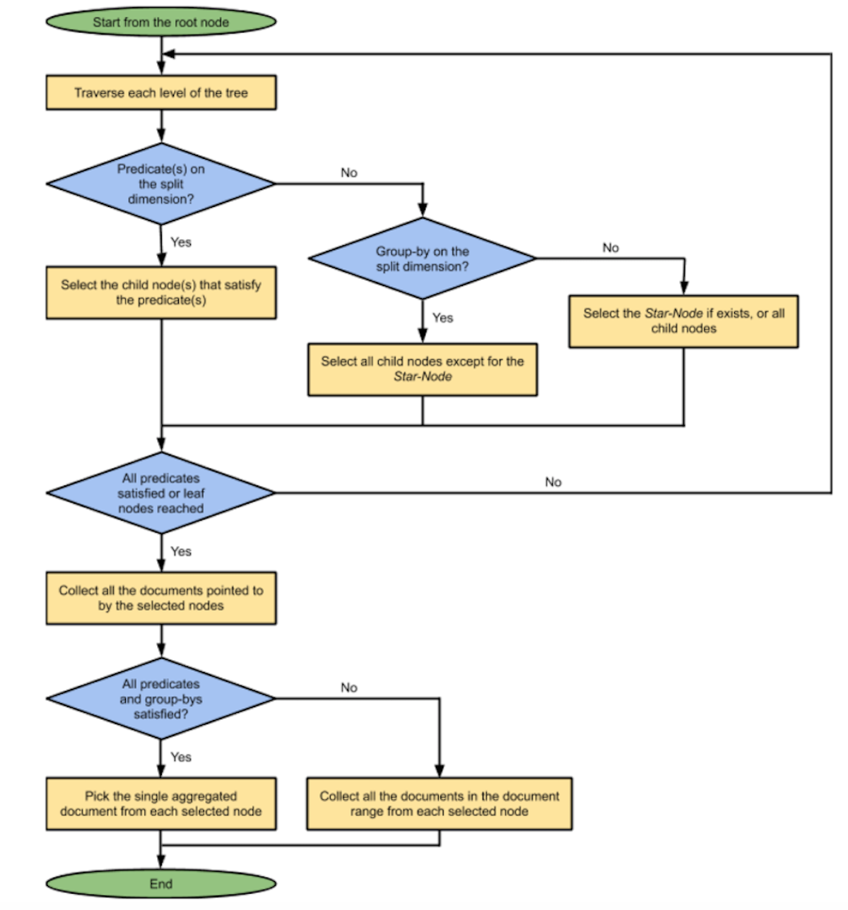 为了解决使用Star-Tree的聚合/分组查询,必须实现过滤器和group-by子句中的所有列(在DimensionsSplitOrder中配置),并且所有聚合都必须预先聚合(在functionColumnPairs中配置) )。查询执行者将选择符合要求的第一棵Star-Tree,如果没有人合格,则退回到常规聚合。