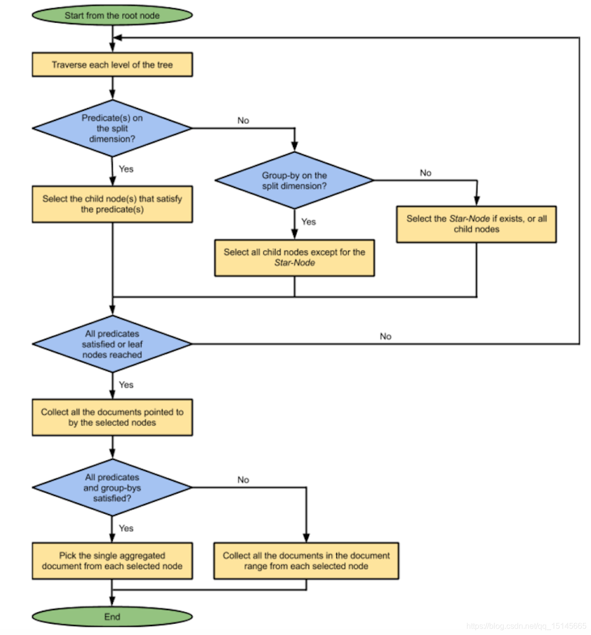 - 星状节点(黄色):非叶节点也可以有一个特殊的子节点,称为星状节点。除去此级别的数据拆分维度后,此节点包含聚合的文档。星状节点可以是叶节点也可以是非叶节点。