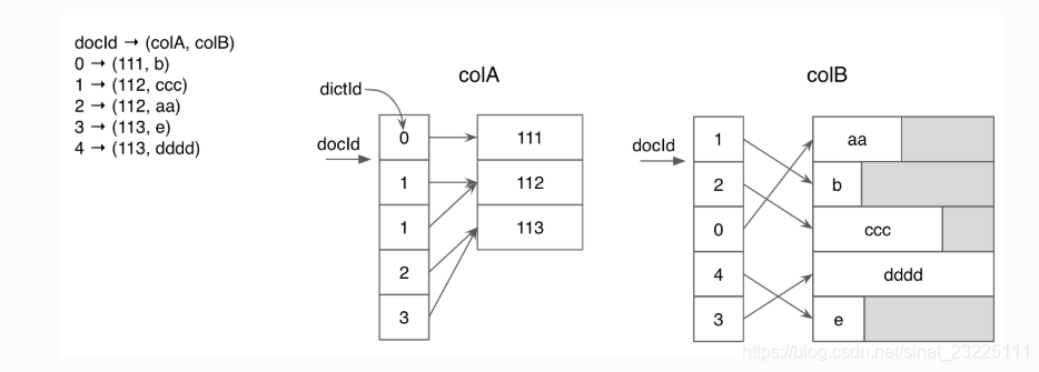 对于列中的每个惟一值,我们为其分配一个id,并从id构建一个字典。然后在前置索引中,我们只存储位压缩的id,而不存储值。