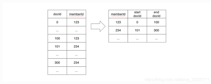在对列进行物理排序时,Pinot在字典编码的基础上使用具有运行长度编码的排序前置索引。我们不是为每个文档id保存字典id,而是为每个值存储一对开始和结束文档id。(为了简单起见,下图不包括字典编码层。)