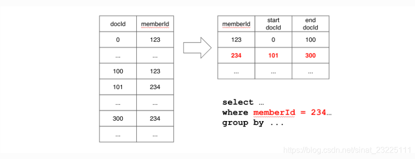 对于下面的示例,如果查询在memberId上有一个过滤器,Pinot将对memberId值执行二分查找,以找到对应过滤值的docid范围对。如果查询需要在过滤后扫描其他列的值,则docId范围内的值将被定位在一起;因此,我们可以从数据局部性中获益良多。