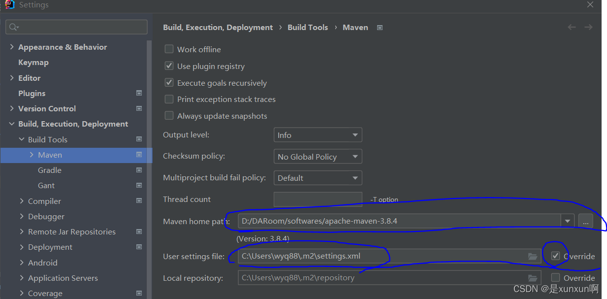 File -> settings,搜索maven,上面的蓝圈选择maven文件夹,下面的选择好自己的settings.xml。