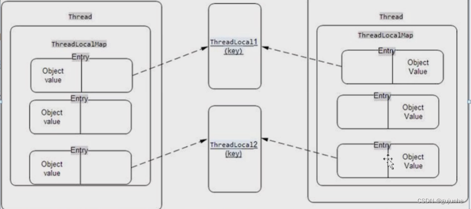 根据我们前面对 ThreadLocal 的分析,我们可以知道每个 Thread 维护一个ThreadLocalMap,这个映射表的 key 是 ThreadLocal 实例本身,value 是真正需要存储的 Object,也就是说 ThreadLocal 本身并不存储值,它只是作为一个 key来让线程从ThreadLocalMap 获取 value。仔细观察 ThreadLocalMap,这个 map是使用 ThreadLocal 的弱引用作为 Key 的,弱引用的对象在 GC 时会被回收。