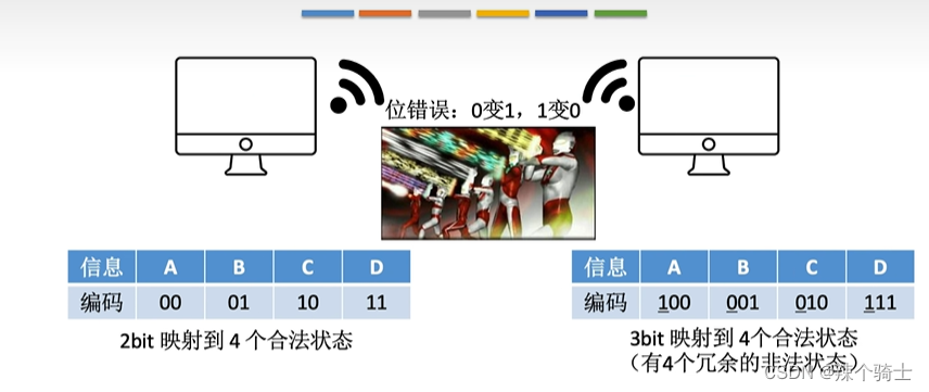 一个编码方案中有若干个码字,各个码字的最小距为码距(d)