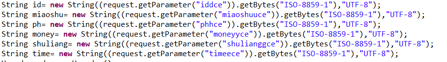 (前面的String id= new String((request.getParameter("iddce"))为获取前端输入的值,后面getBytes("ISO-8859-1"),"UTF-8")就是让它的编码方式改成中文编码)