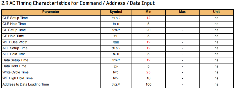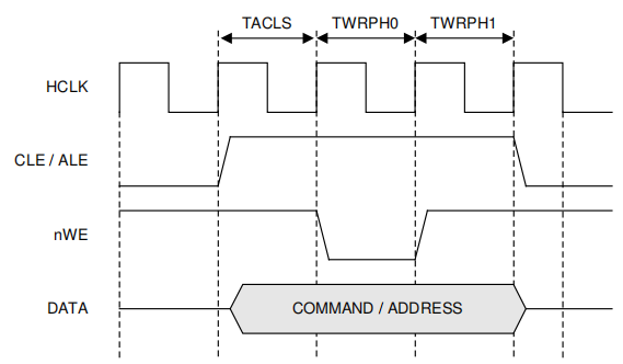 /* 3. 硬件相关的设置: 根据NAND FLSAH手册设置时间参数*//* HCLK = 100MHz = 10的负8次方/秒 = 10ns* TACLS:CLE/ALE信号变为高电平后,nWE信号多久能变为低电平。由NAND FLASH手册可知,CLE/ALE和nWE能同时发出,所以TACLS可以为0* TWRPH0:nWE的脉冲宽度。Duration = HCLK x ( TWRPH0 + 1 )。由NAND FLASH手册可以看出(tWP),Duration最小值为12ns,所以TWRPH0>=0.2,取TWRPH0=1* TWRPH1:nWE信号又低电平变为高电平后,CLE/ALE信号多久才由高电平变为低电平。Duration = HCLK x ( TWRPH1 + 1 )。由NAND FLASH手册可以看出(tCLH),Duration最小值为5ns,所以TWRPH1>=-0.5,取TWRPH1=0*/