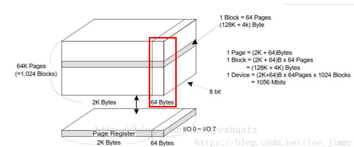 那么OOB在NAND FLASH的什么地方呢?我们看一下下面这个图,红色框出来的64字节就是OOB区,每一个page都有一个OOB。