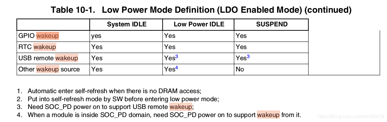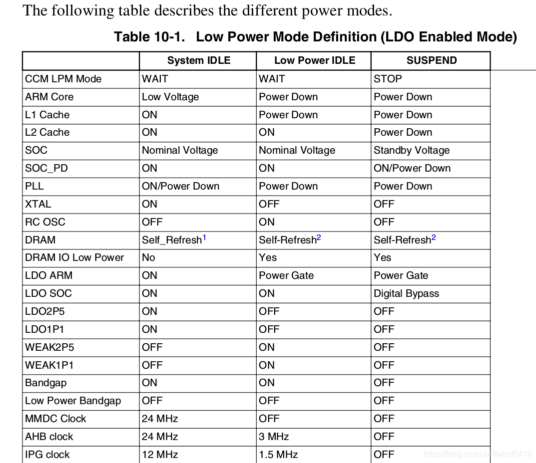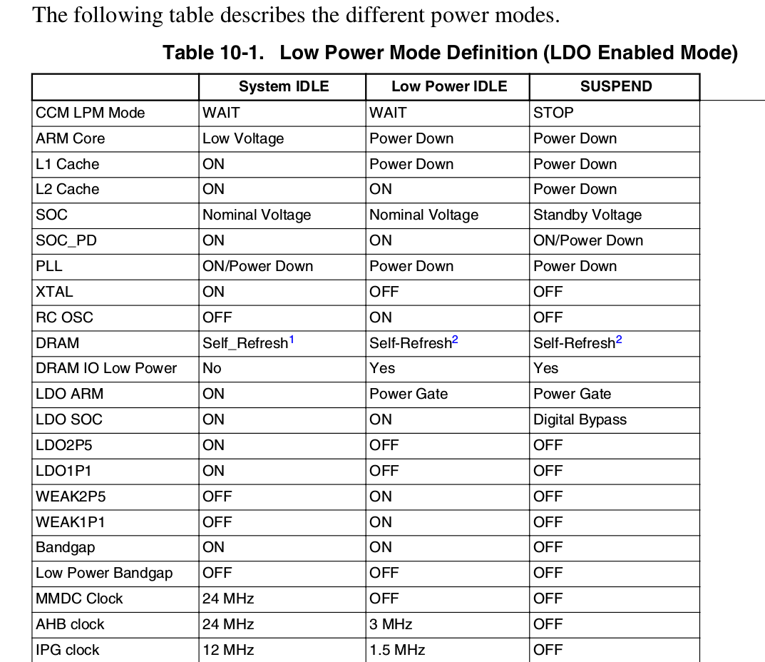 睡眠总体上可以分为浅睡及深睡眠,从PM管理上来说,主要是电源域和时钟控制的不同,如下IMX6介绍: